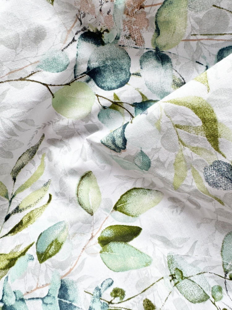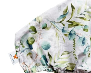 Prześcieradło bawełniane z gumką, we wzór w liście eukaliptusa, na materac o wymiarach 120x60 o wysokości do ok. 10 cm.