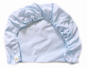 Prześcieradło bawełniane z gumką w kolorze błękitnym, na materac o wymiarach 80x40 cm i wysokości do ok. 4 cm.