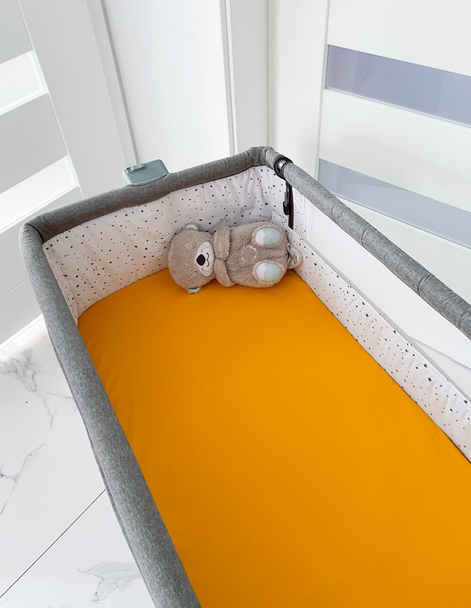 Prześcieradło z gumką wykonane z bawełny w kolorze mango, na materac o wymiarach 90x50, dedykowane do łóżeczek dostawnych.