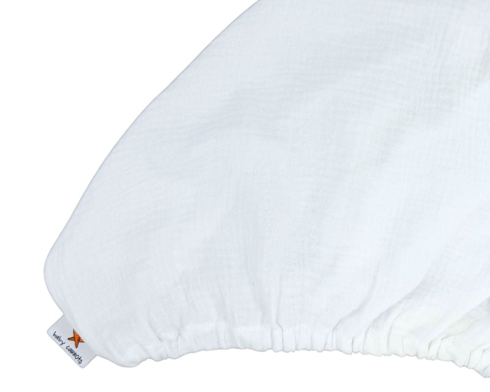Prześcieradło muślinowe z gumką w kolorze białym, pasujące na materac łóżeczka dziecięcego CHICCO NEXT2ME forever o wymiarach 110x58 i wysokości ok. 10 cm.