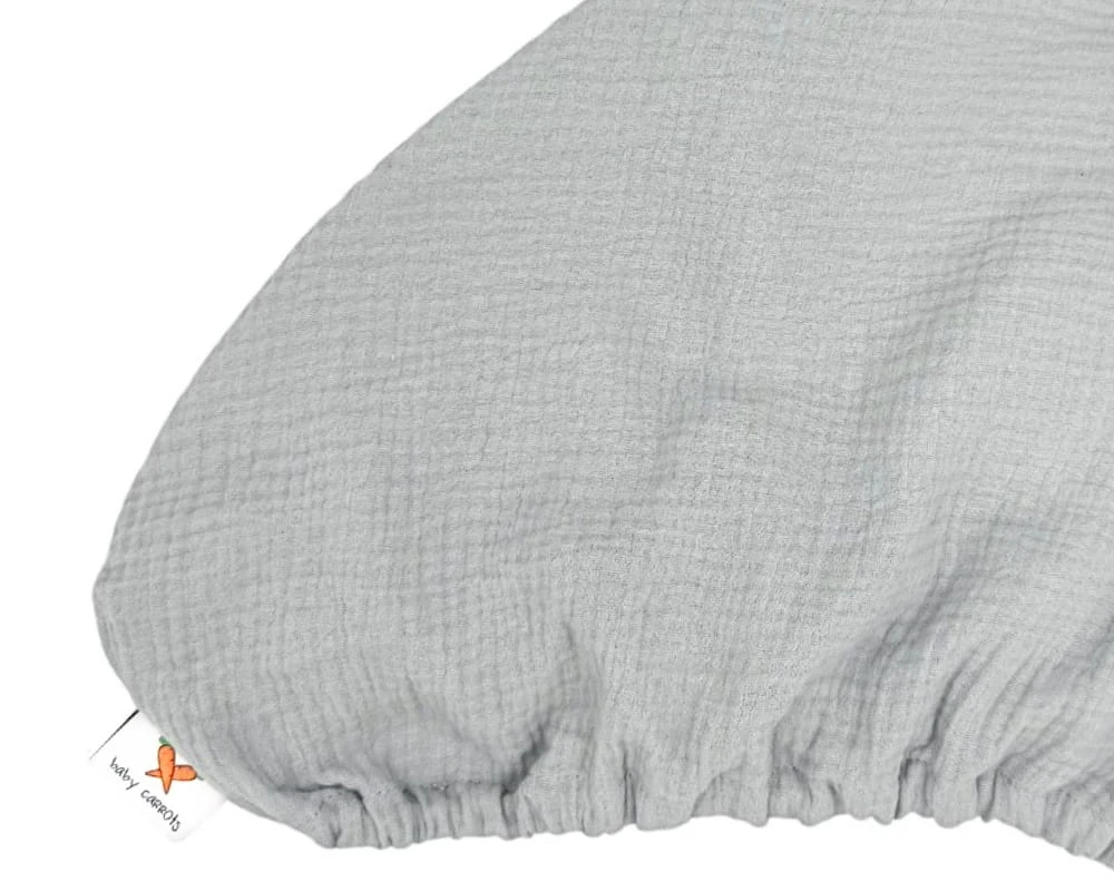 Prześcieradło muślinowe z gumką w kolorze szarym, pasujące na materac łóżeczka dziecięcego CHICCO NEXT2ME forever o wymiarach 110x58 i wysokości ok. 10 cm.