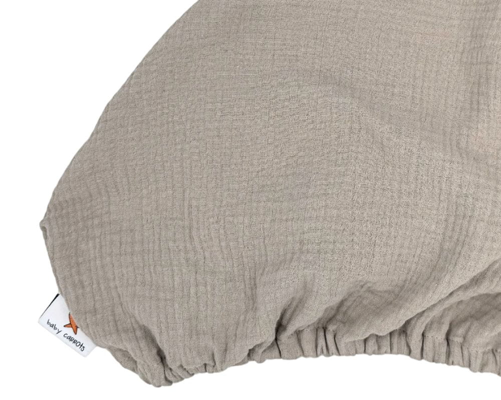 Prześcieradło muślinowe z gumką w kolorze beżowym , pasujące na standardowy materac łóżeczka dziecięcego o wymiarach 120x60 i wysokości ok. 10 cm.