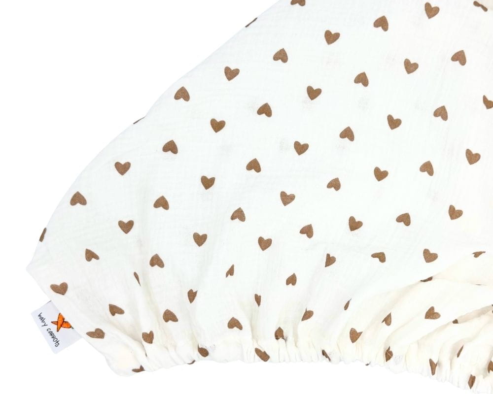 Prześcieradło muślinowe z gumką w kolorze białym w brązowe serduszka , pasujące na standardowy materac łóżeczka dziecięcego o wymiarach 120x60 i wysokości ok. 10 cm.