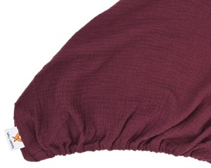 Prześcieradło muślinowe z gumką w kolorze burgundowym, pasujące na standardowy materac łóżeczka dziecięcego o wymiarach 120x60 i wysokości ok. 10 cm.