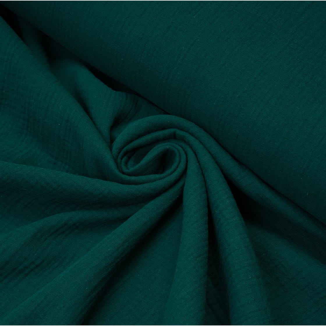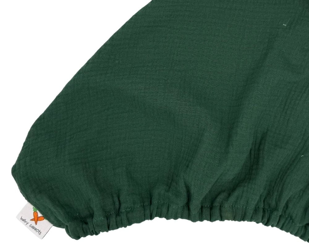 Prześcieradło muślinowe z gumką w kolorze ciemnej, butelkowej zieleni, pasujące na standardowy materac łóżeczka dziecięcego o wymiarach 120x60 i wysokości ok. 10 cm.