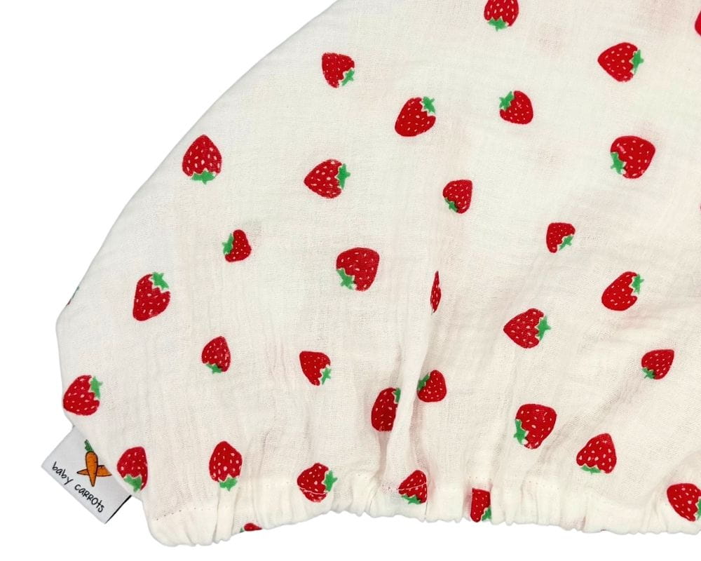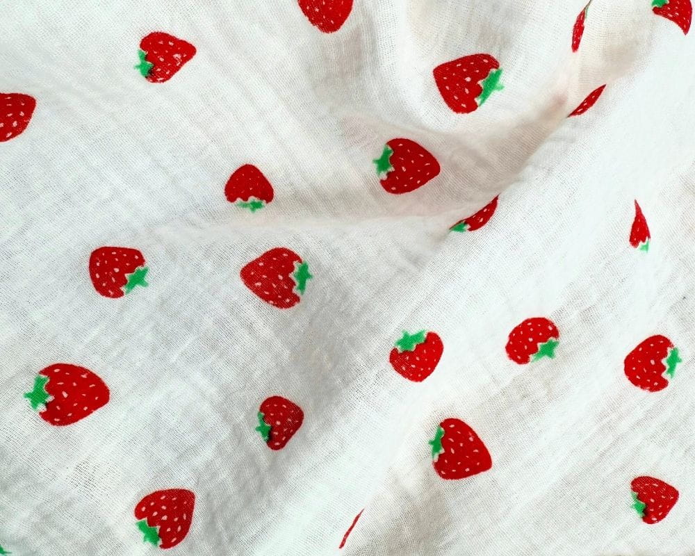 Prześcieradło muślinowe z gumką w kolorze kremowym w truskawki , pasujące na standardowy materac łóżeczka dziecięcego o wymiarach 120x60 i wysokości ok. 10 cm.