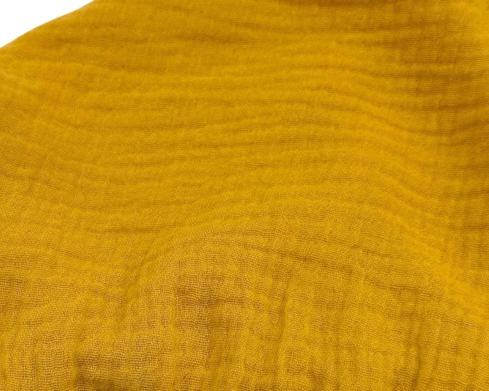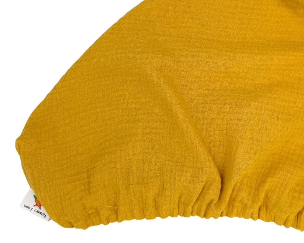 Prześcieradło muślinowe z gumką w kolorze musztardowym , pasujące na standardowy materac łóżeczka dziecięcego o wymiarach 120x60 i wysokości ok. 10 cm.