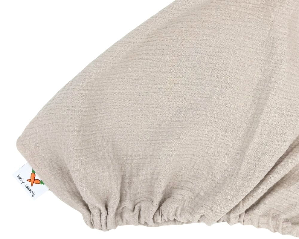 Prześcieradło muślinowe z gumką w kolorze naturalnym (neutralny, jasny beż), pasujące na standardowy materac łóżeczka dziecięcego o wymiarach 120x60 i wysokości ok. 10 cm.