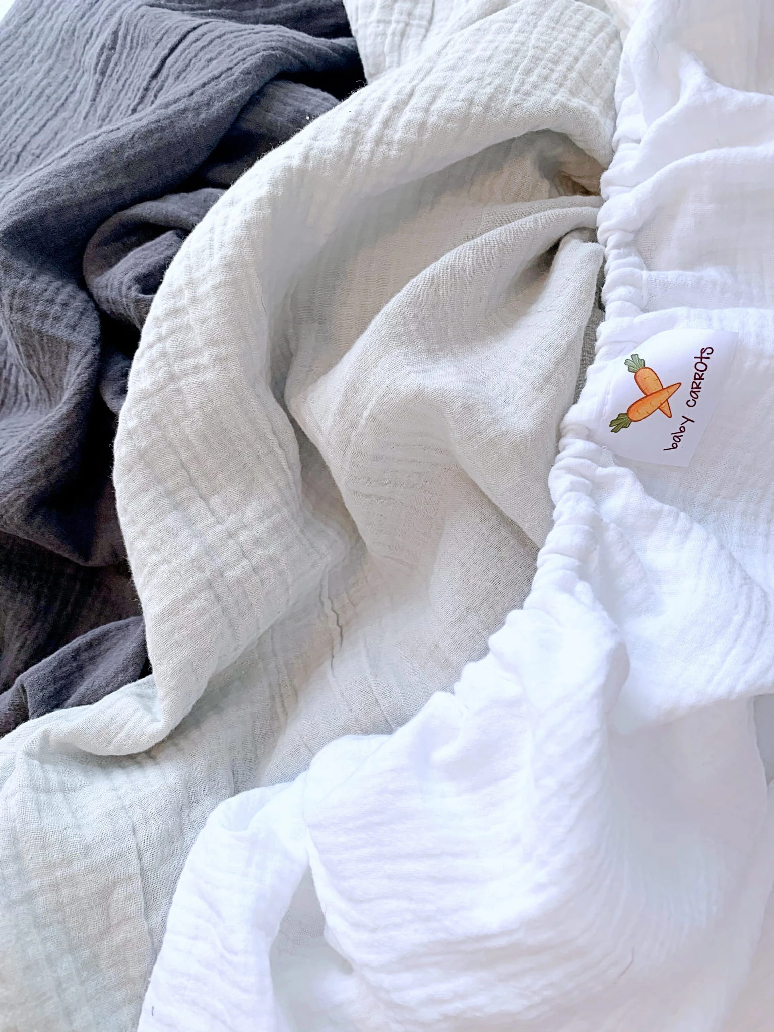 - rodzaj materiału: najwyższej jakości, certyfikowany muślin double gauze - charakteryzuje się dwiema cienkimi, luźno tkanymi warstwami, podczas gdy zwykły muślin składa się z jednej warstwy