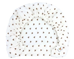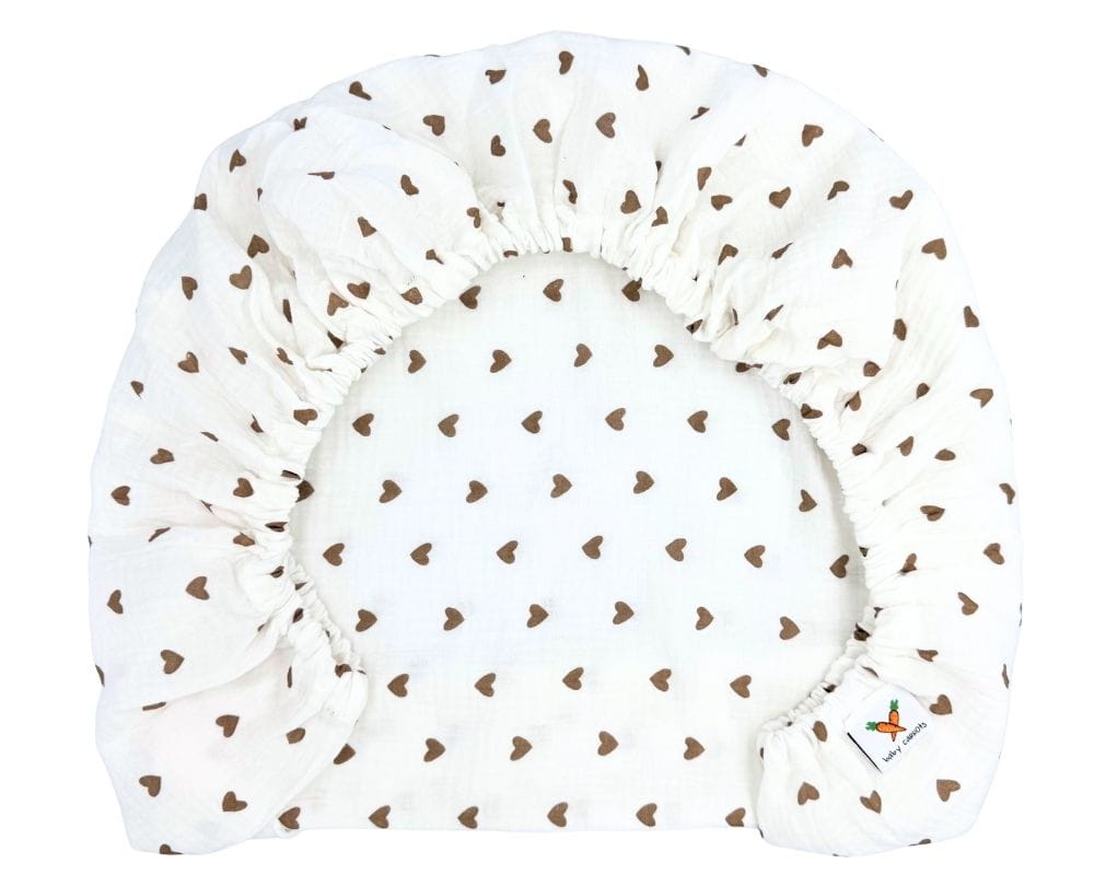 Prześcieradło muślinowe z gumką w kolorze białym w brązowe serduszka, na materac o wymiarach 80x40, dedykowane do gondoli i kołysek.