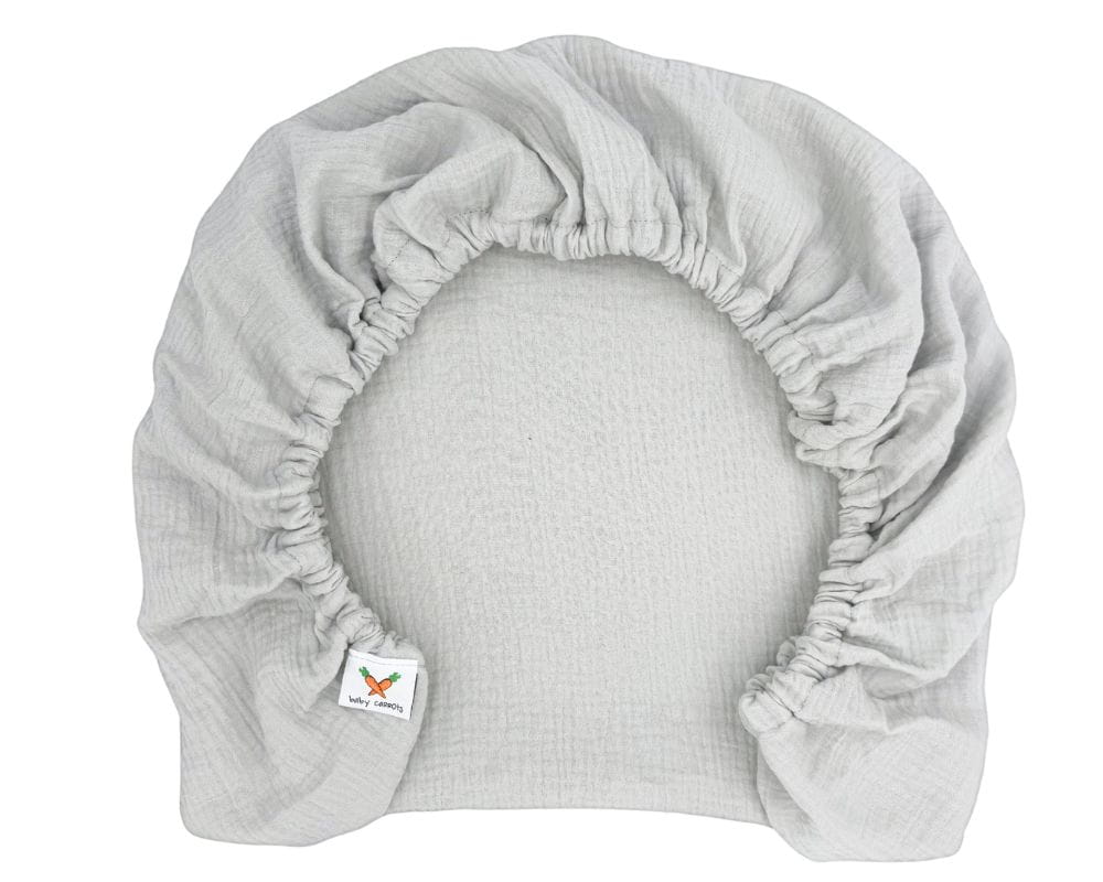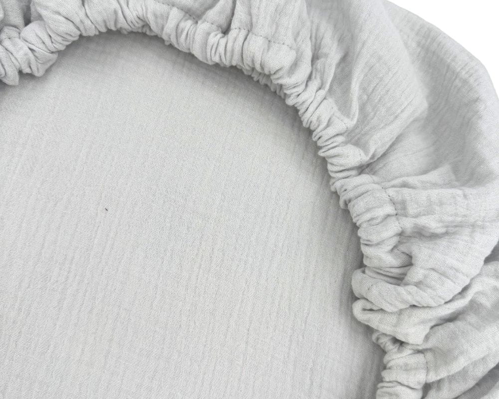 Prześcieradło muślinowe z gumką w kolorze jasnej szarości, na materac o wymiarach 80x40, dedykowane do gondoli i kołysek.