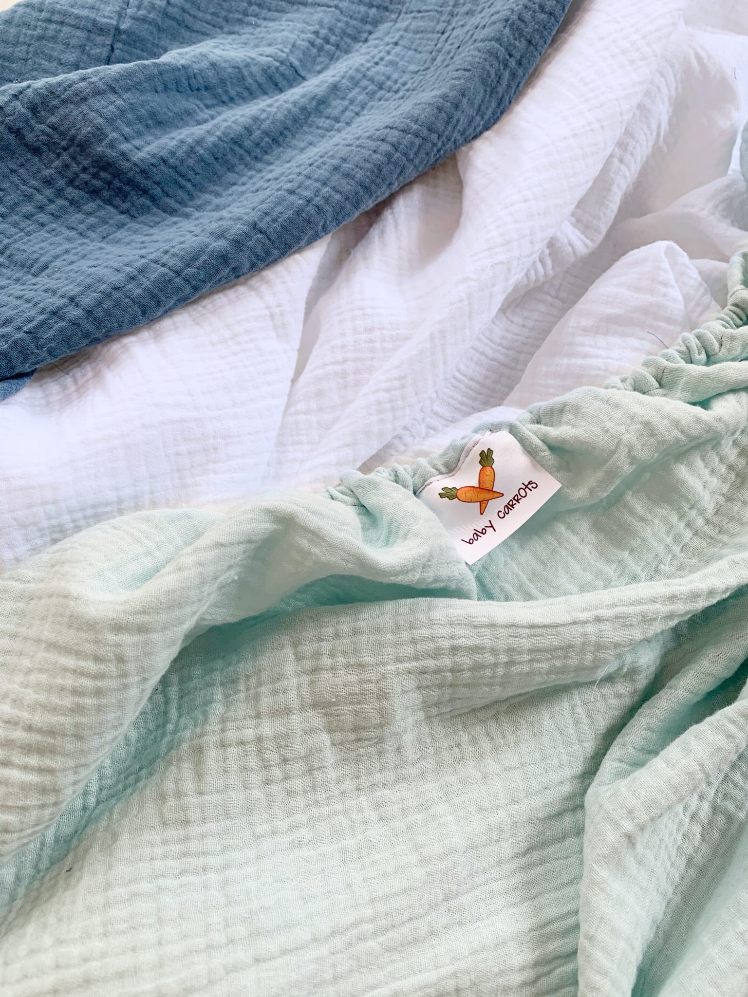 - rodzaj materiału: najwyższej jakości, certyfikowany muślin double gauze - charakteryzuje się dwiema cienkimi, luźno tkanymi warstwami, podczas gdy zwykły muślin składa się z jednej warstwy