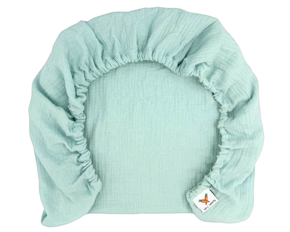 Prześcieradło muślinowe z gumką w kolorze miętowym, na materac o wymiarach 80x40, dedykowane do gondoli i kołysek.