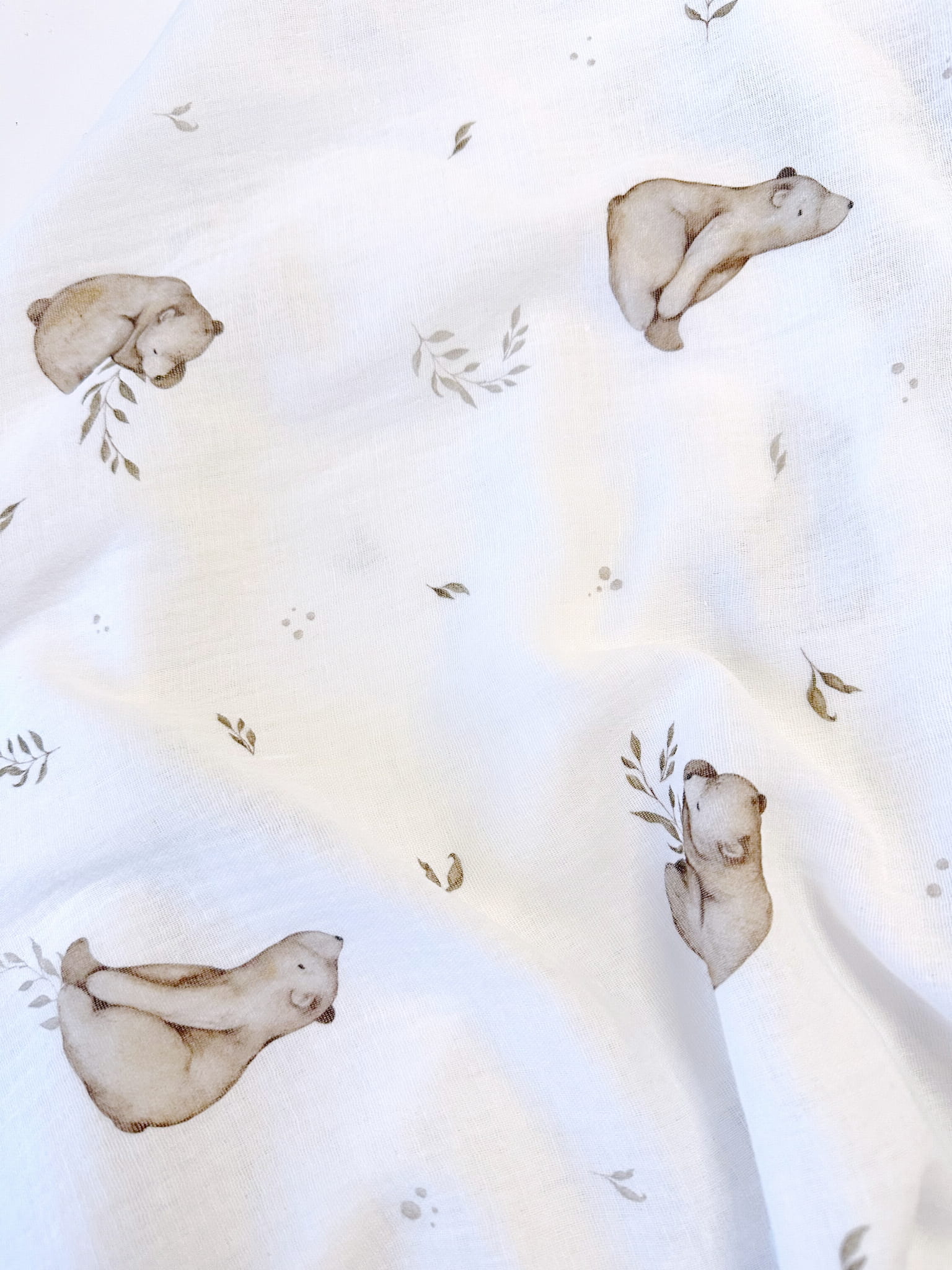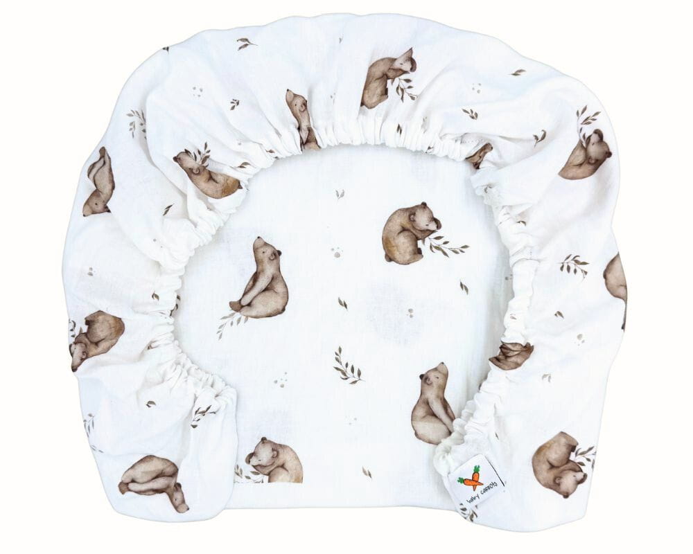 Prześcieradło muślinowe z gumką w kolorze białym z motywem leśnym w niedźwiadki, na materac o wymiarach 80x40, dedykowane do gondoli i kołysek.