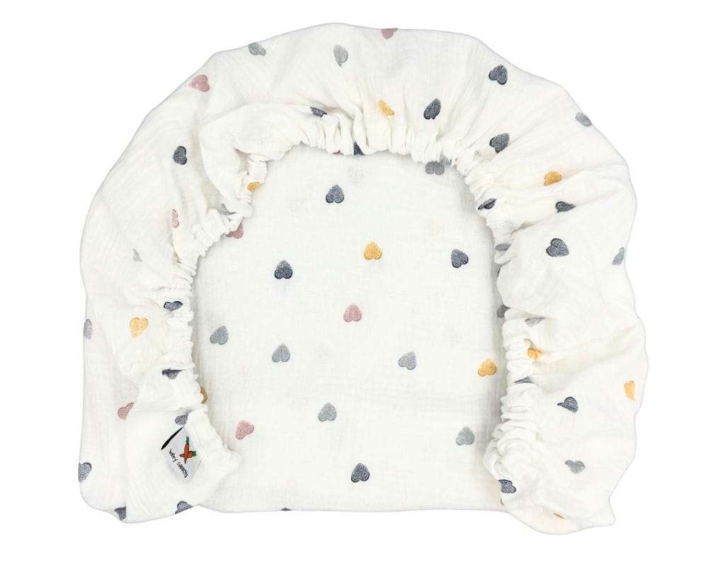 Prześcieradło muślinowe z gumką w kolorze ecru z nadrukiem w serduszka, na materac o wymiarach 80x40, dedykowane do gondoli i kołysek.
