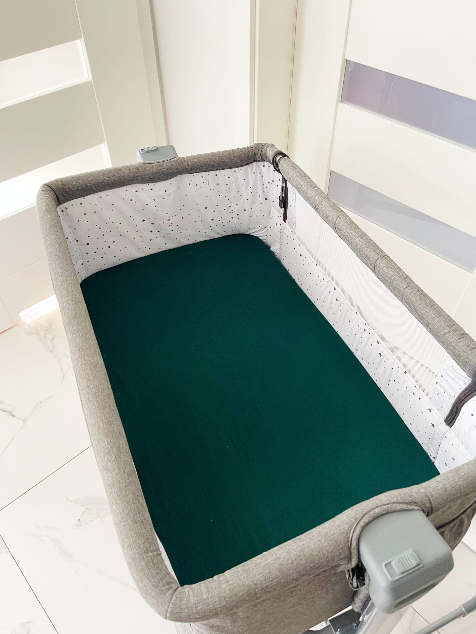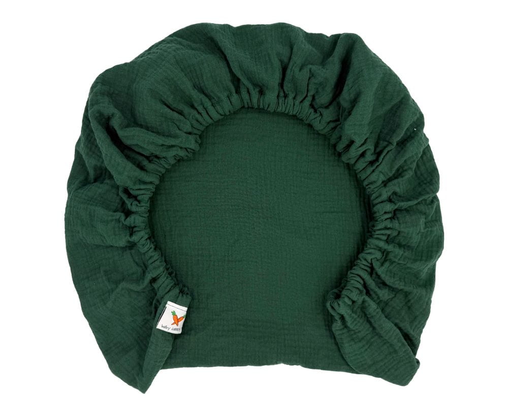 Prześcieradło muślinowe z gumką w kolorze ciemnej, butelkowej zieleni, na materac o wymiarach 90x50, dedykowane do łóżeczek dostawnych.