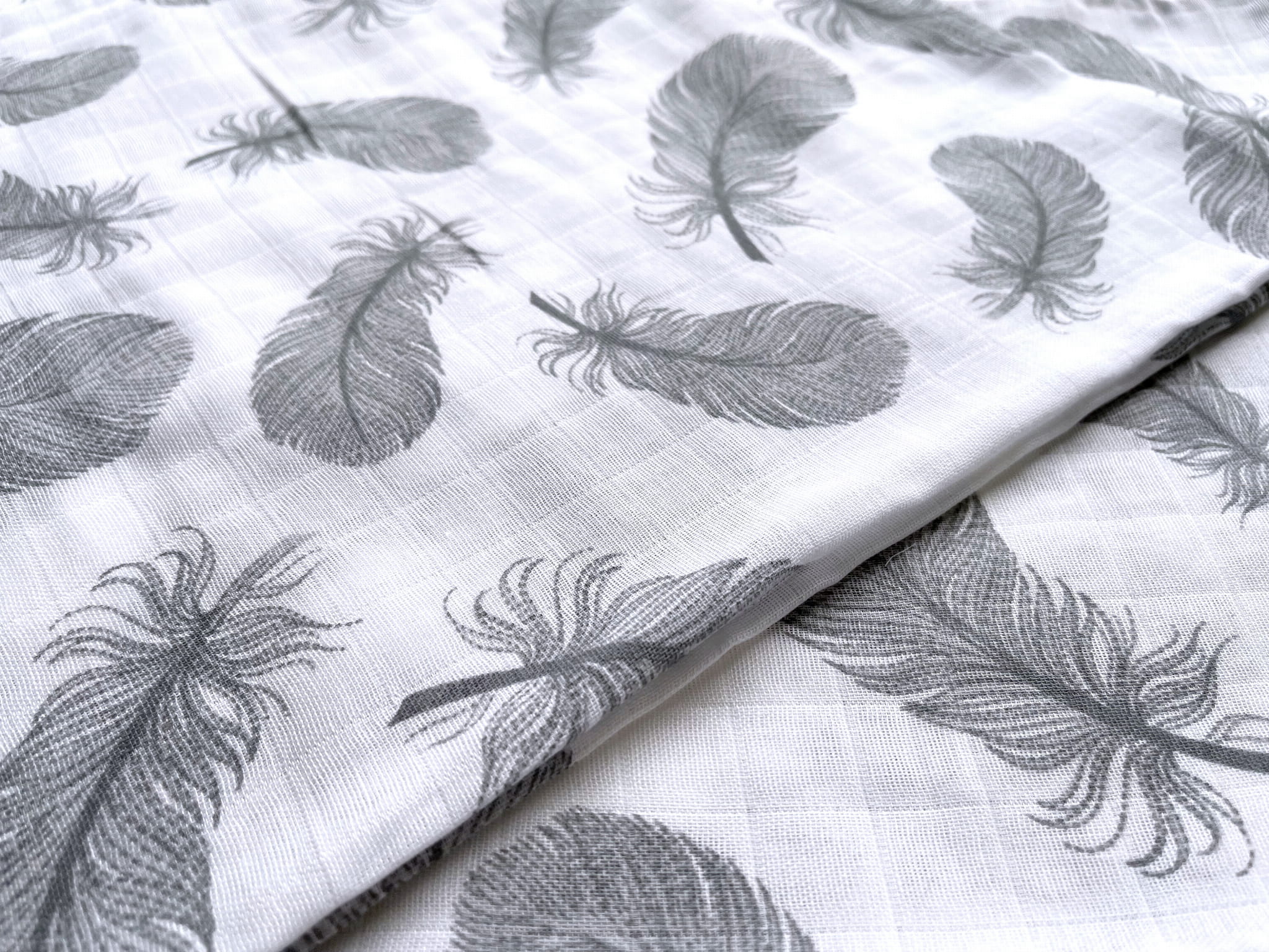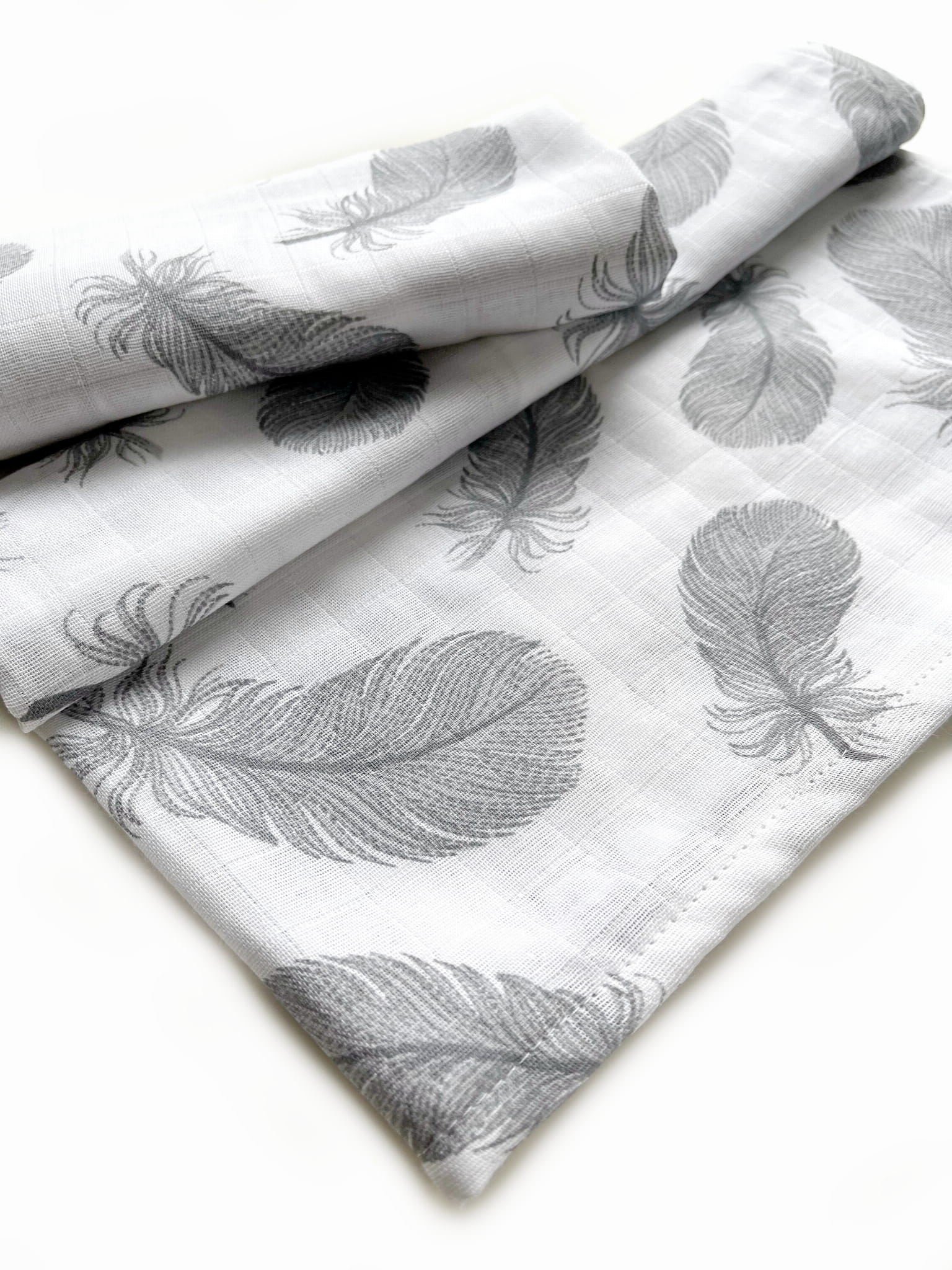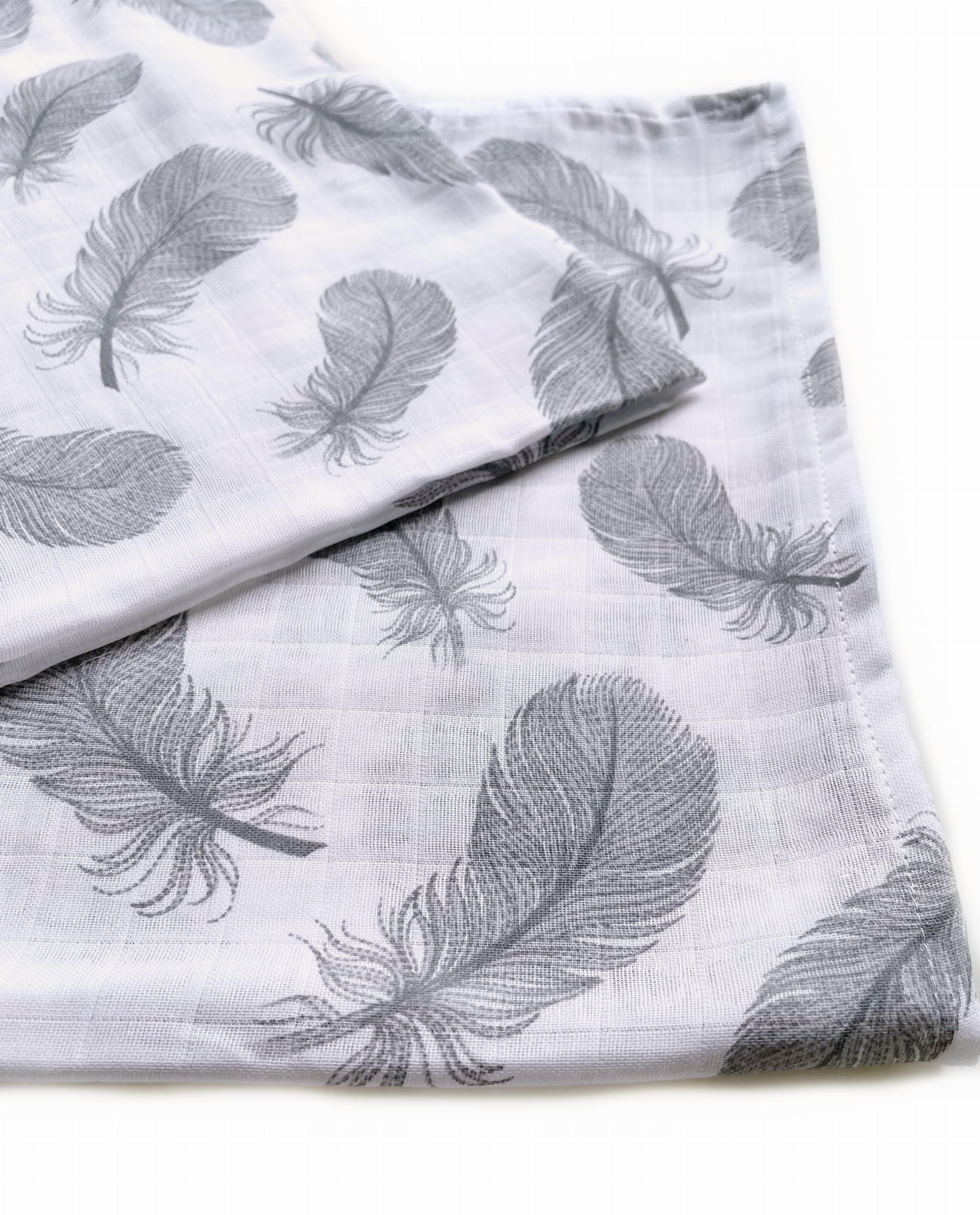 Zestaw dwóch pieluch w rozmiarze 70x80 cm, wykonanych z białego muślinu bawełnianego w piękne, delikatne, szare piórka.